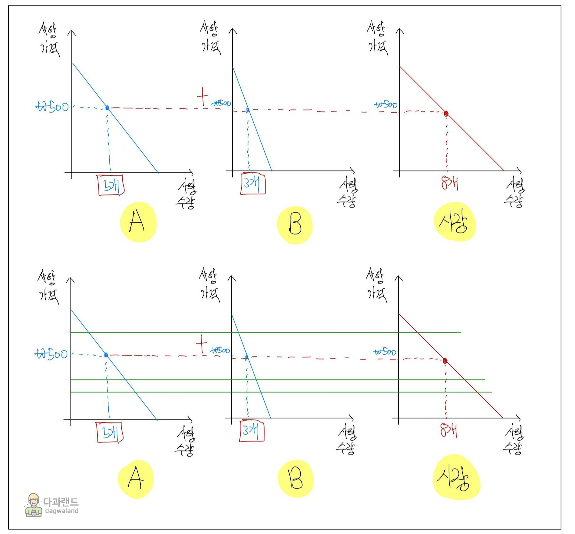 위의 3개 그래프를 보시면, 500원일 때 A가 원하는 사탕의 개수는 5개, B는 3개인 것을 알 수 있습니다.