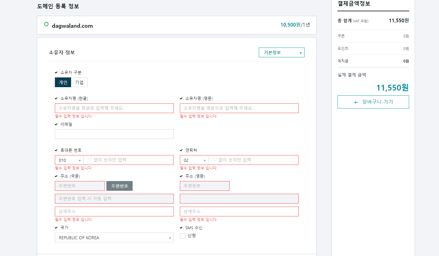 여기서 입력하시는 소유자 정보는 whois에 등록됩니다.