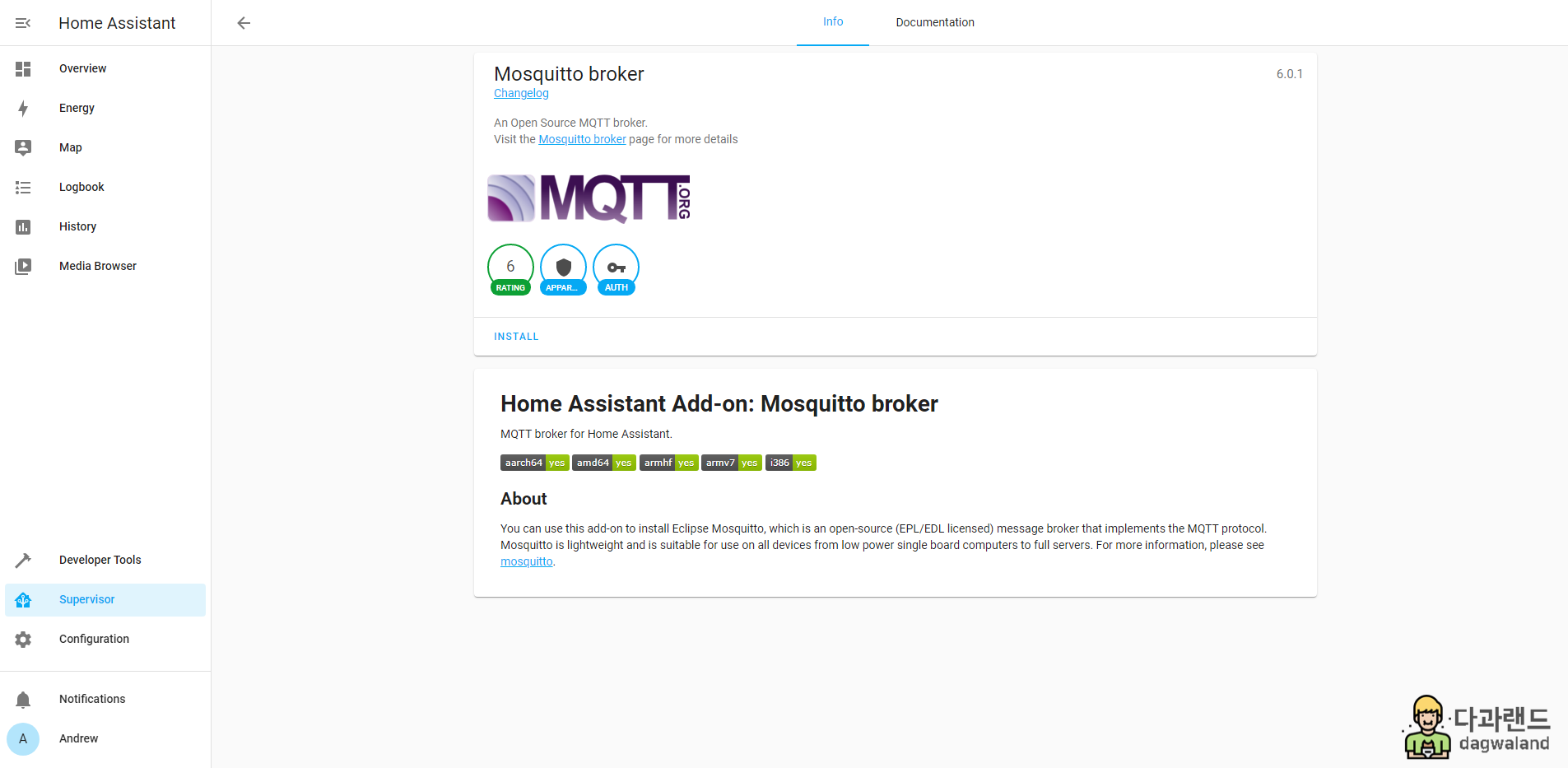 HA의 Supervisor > Add-on store > Mosquitto broker 검색을 하면 아래와 같은 설치페이지를 볼 수 있다.