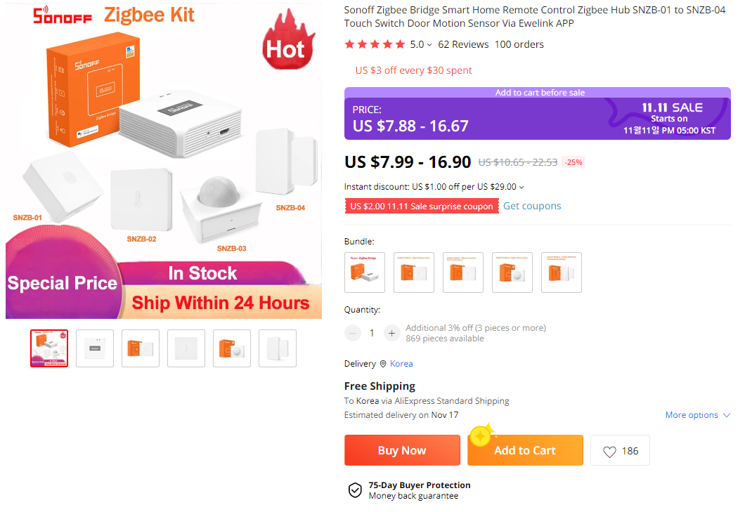 알리를 탐험하던 중 sonoff 사의 센서들이 가격과 디자인 모두 맘에 들었다.