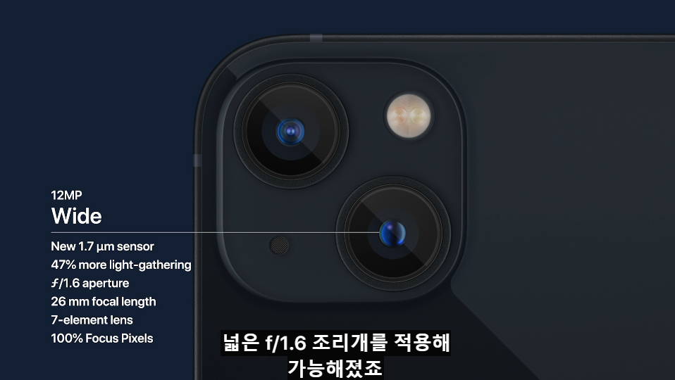 - 후면카메라는 12MP을 지원하며, f/1.8입니다. 새로운 ISP가 적용되어서 Smart HDR 적용이 가능합니다. 4K로 녹화가 가능합니다.